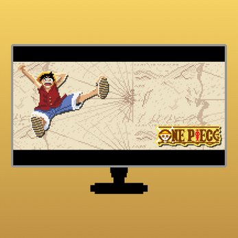 A desktop wallpaper of Luffy from One Piece in pixel art